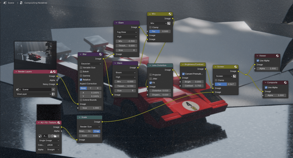This was also an exercise in compositing. I used a blur node in conjunction with fog glow to lower the overall sharpness of the scene. I also used a lens distortion node. The node had some dispersion and distortion to give the scene a more authentic and more imperfect look and feel. For the film grain I used a texture from a pack I found online from Adi Ulitski (this pack features quite a lot in my work). There was also a bloom node added to add to the film look. And finally I added a contrast node to make the scene look more punchy.