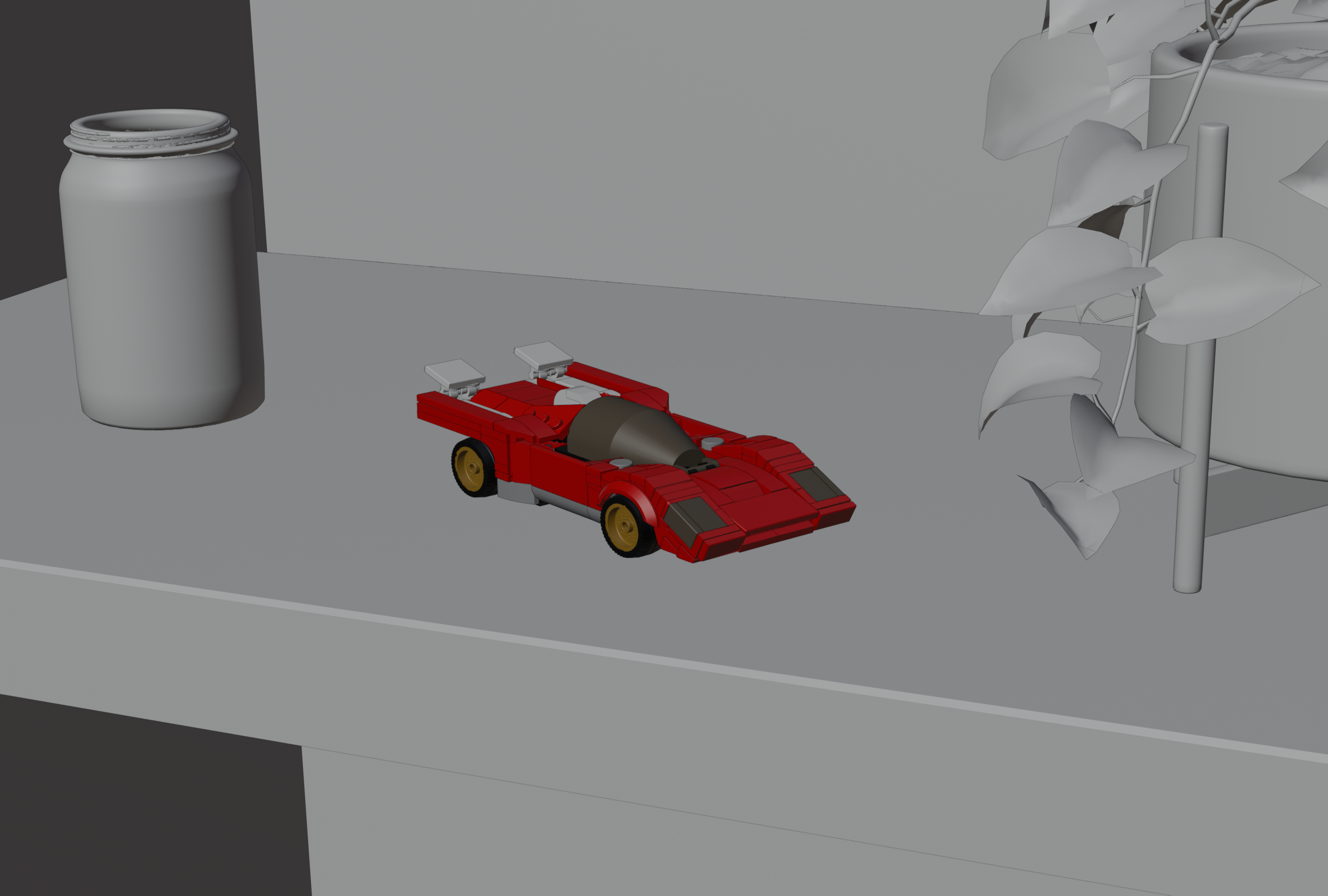 In the shot I used a model from Mecabricks as well as a plant from Sketchfab. There were also several materials used from Polyhaven. I chose to use a Lego model in the scene because of the model’s shape and complexity. This made it perfect for the main subject of the image as it was eye catching and interesting to look at. The colour also contributed by creating more contrast thus making the car pop more.