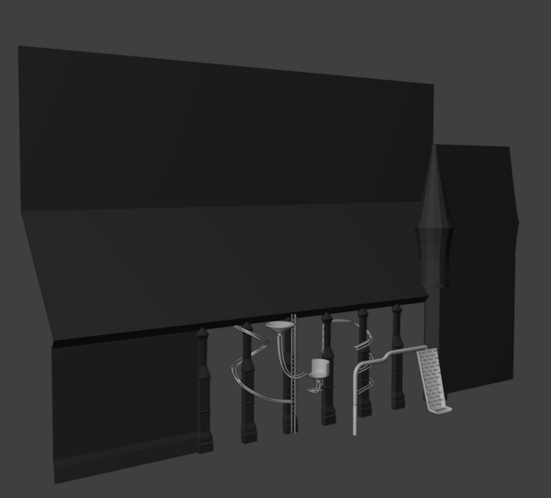 Using this facade made by Oana, I started building my scene. After some testing other ideas, I decided on making a marble run. To make use of the architecture I would have the marbles travel around the pillars, and follow the architecture.